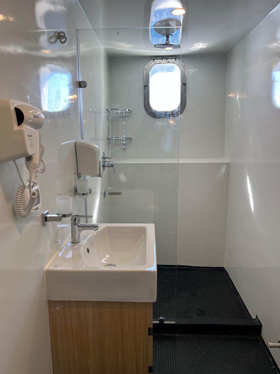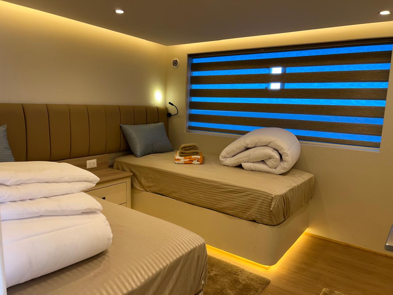 | Cabins | 18 x twin cabins with A/C and en-suite bathrooms. (6 cabins downstairs with side-by-side beds, 6 on the upper deck with side-by-side beds and 2 Panorama suites. 4 master suites on the high deck fitted with A/C, en-suite bathrooms with separate shower and large beds. 2 of the high suites are fitted with mini bar. |