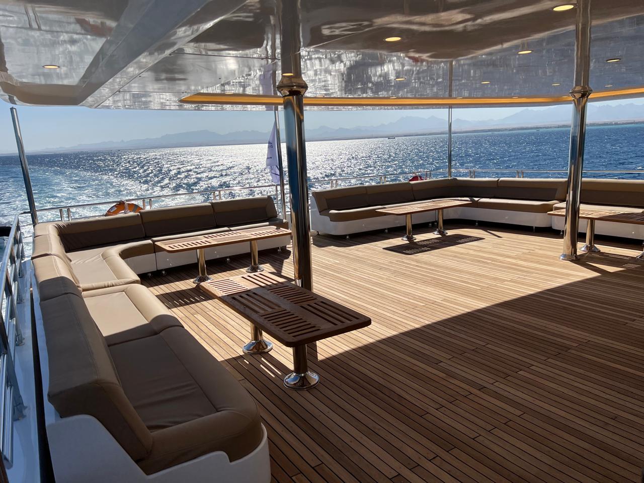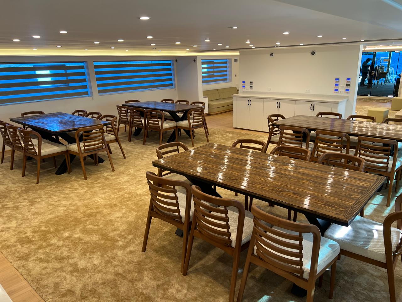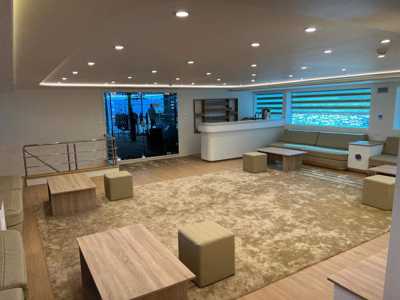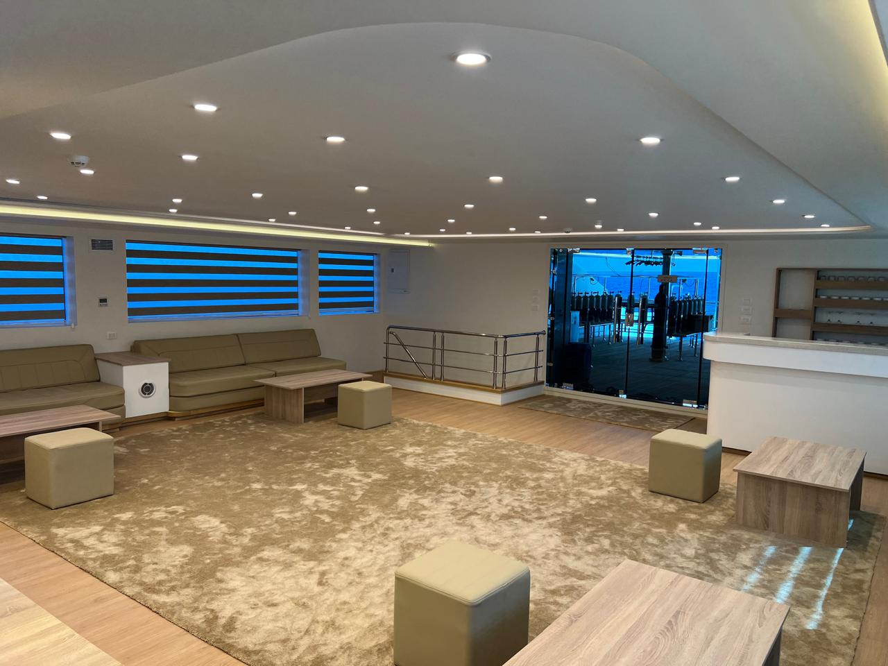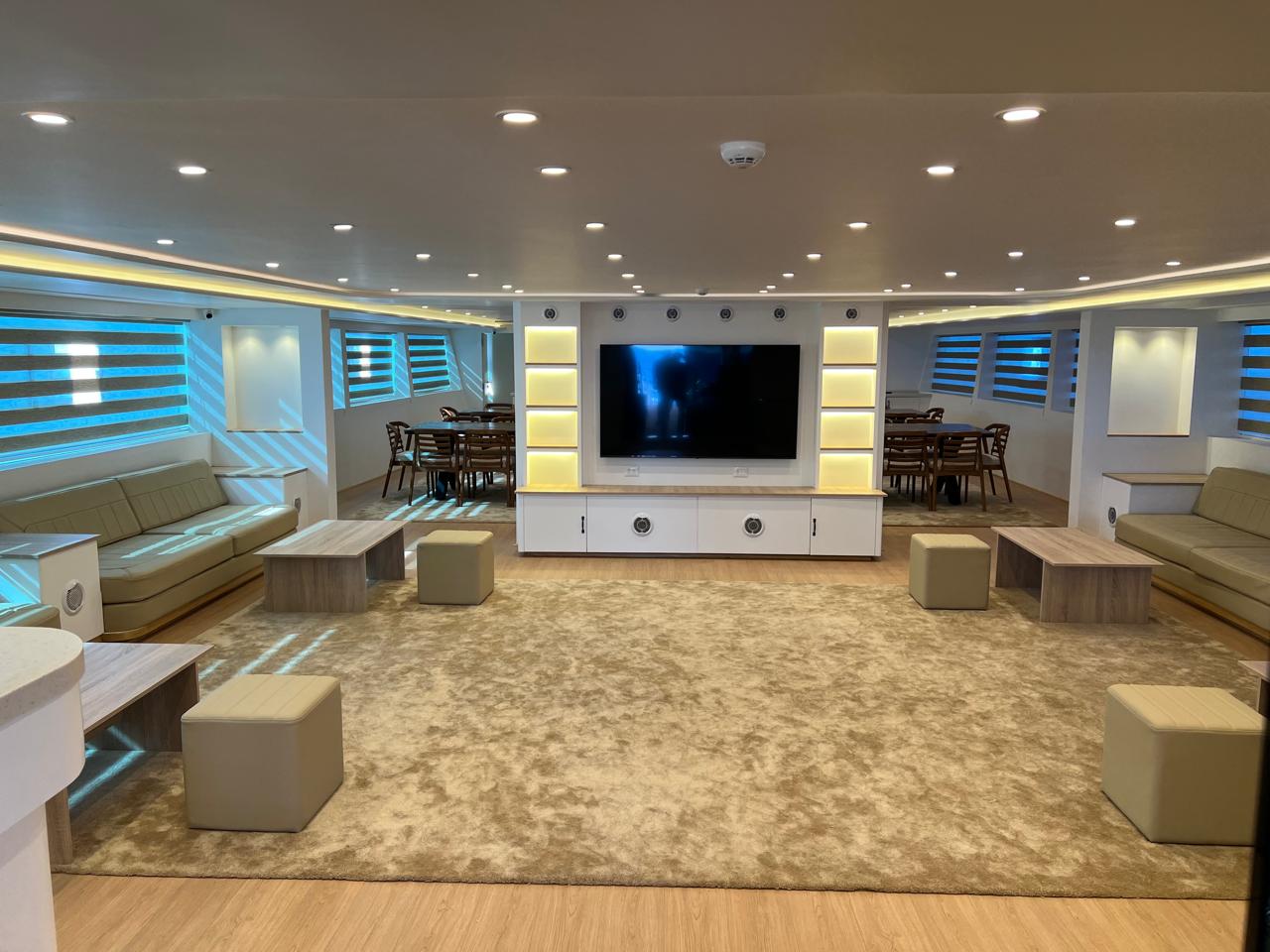 | Salon | Lounge: A separate space furnished with comfortable sofas, coffee tables, and a large bar stocked with both soft and alcoholic drinks. Dining Area: A spacious area equipped with large tables and comfortable seating to accommodate all guests. Meals are served in an open buffet style. |