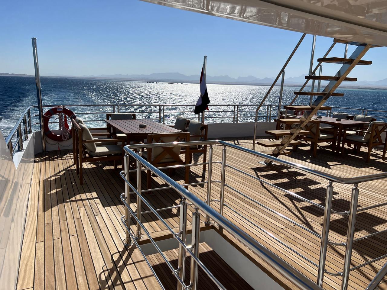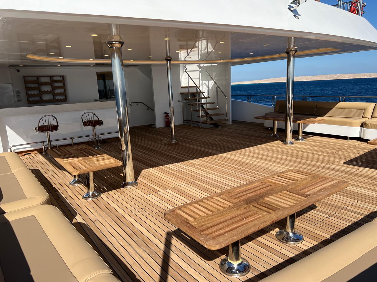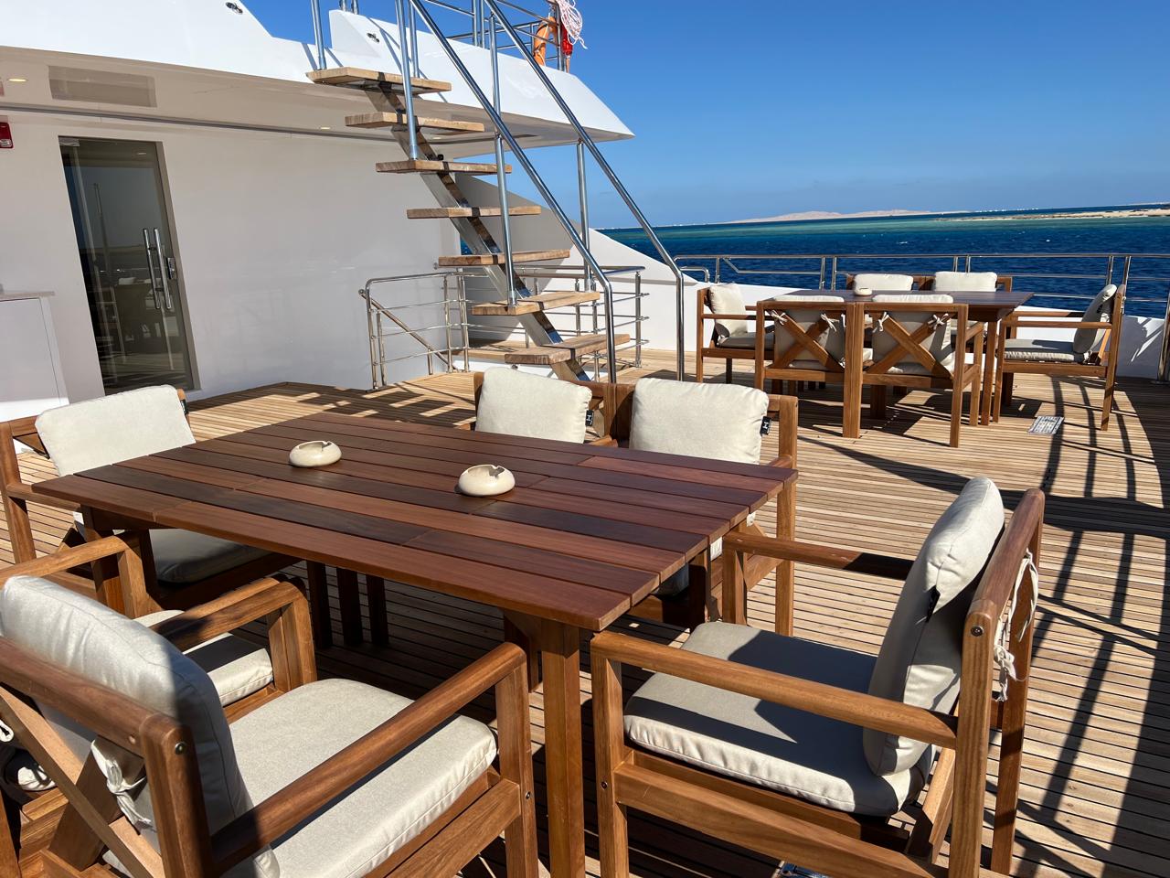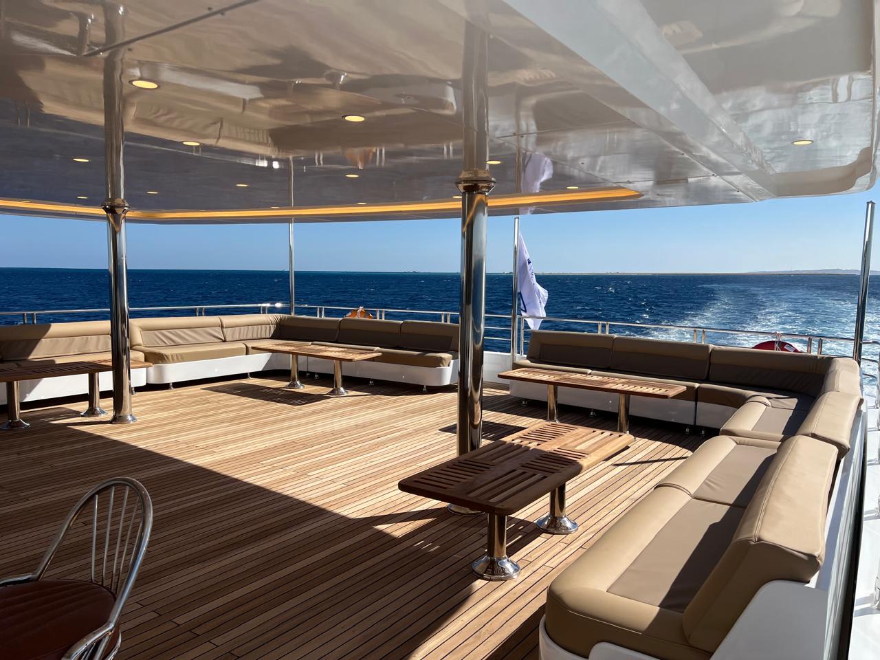 | Salon | Lounge: A separate space furnished with comfortable sofas, coffee tables, and a large bar stocked with both soft and alcoholic drinks. Dining Area: A spacious area equipped with large tables and comfortable seating to accommodate all guests. Meals are served in an open buffet style. |