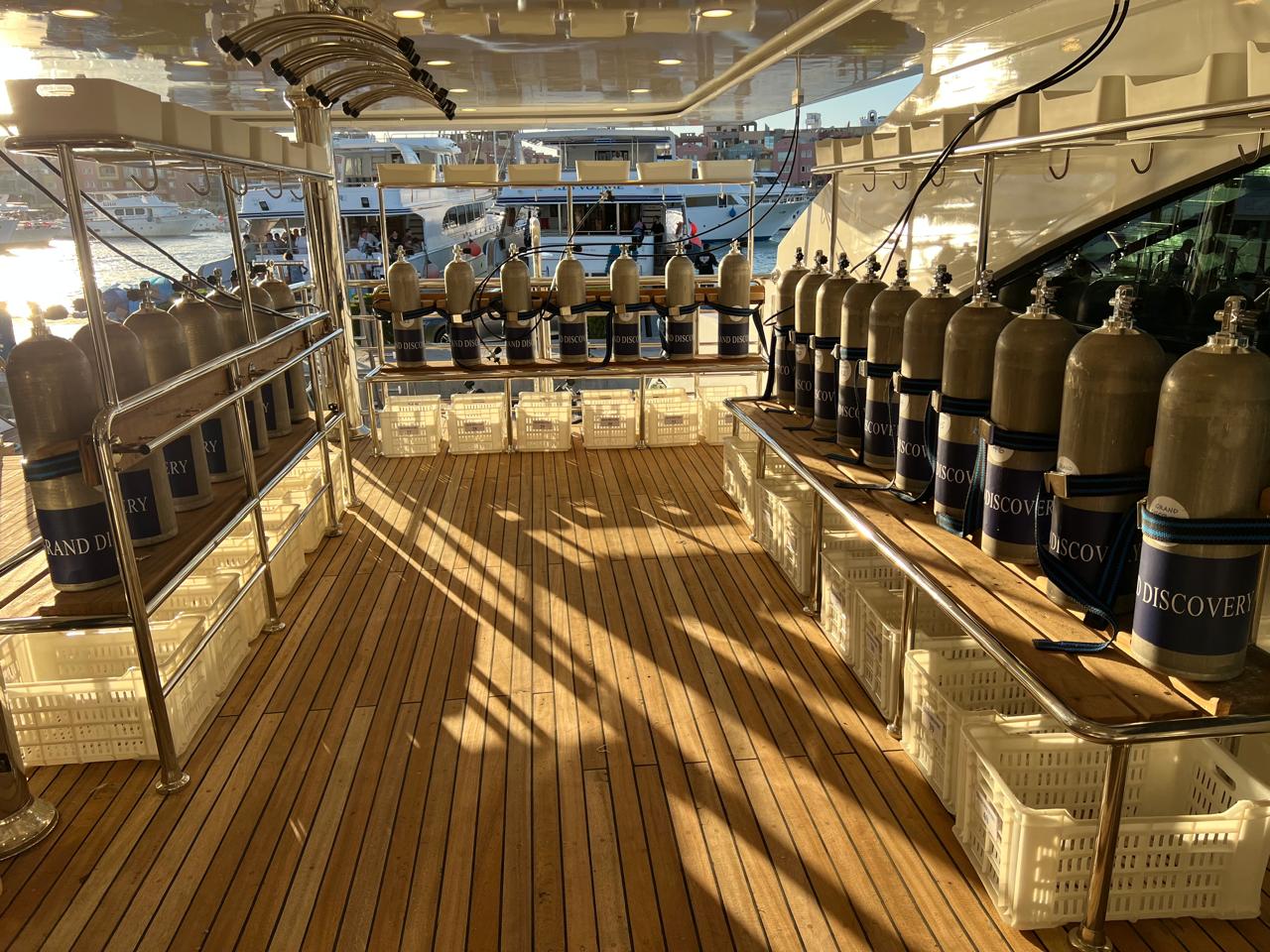 MY Grand Discovery measures 45m in length and was built in December 2025, offering excellent stability and comfort for divers. The yacht features 18 twin cabins with A/C and en-suite bathrooms, in addition to four elegant master suites on the high deck, two of which include a minibar. The spacious salon provides a separate dining and lounge area with a fully stocked bar, as well as a large TV, music system, and small library. Fully equipped for diving, the vessel offers Bauer compressors, a Nitrox membrane system, 52 aluminium tanks, and three zodiacs to ensure smooth and safe diving operations. Two shaded sundecks and a skydeck with a Jacuzzi provide ample space for all guests to relax between dives.